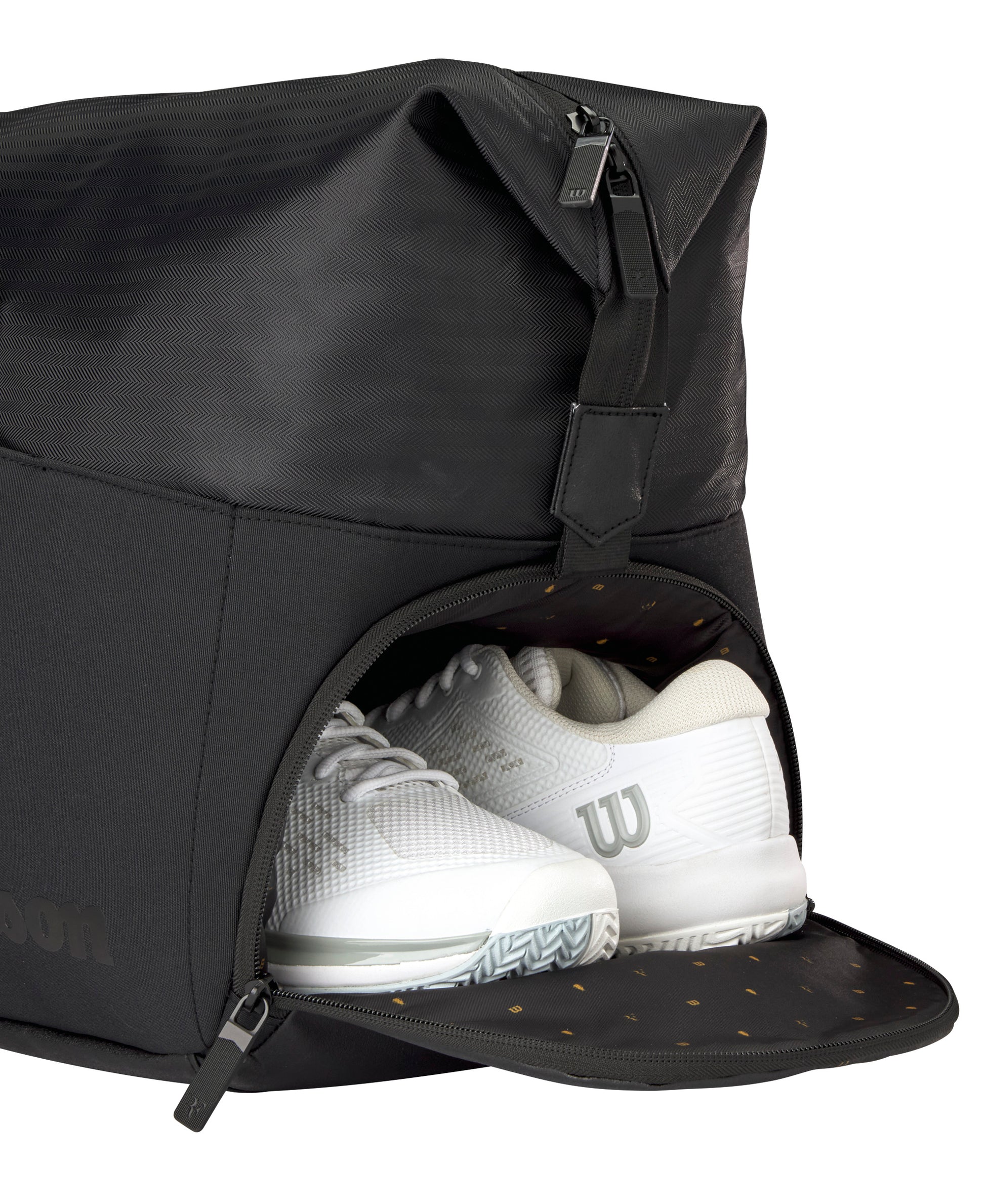 - Compartment fully encloses rackets, larger gear and other equipment